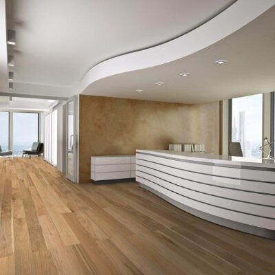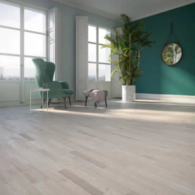 “Tvålagers parkett – ytan är tillverkad av massivt trä, som ek, och basen är av björkfanér eller ek. Tack vare den tunna konstruktionen (10-12 mm) och den tätta träkonstruktionen ger den stabilitet, motstår temperatur- och fuktnivåsvängningar och är särskilt lämplig för ‘varma’ golv. Trots den tunna konstruktionen är detta golv tillräckligt hållbart.”