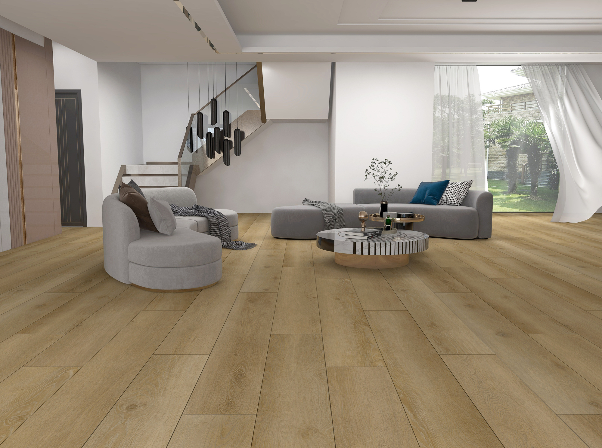 Kvarca vinylgolv med hög slitstyrka, vattentätt, med fasade kanter, med en speciell ljudisolerande undersida som ger komfort och effektiv värmeledning.
