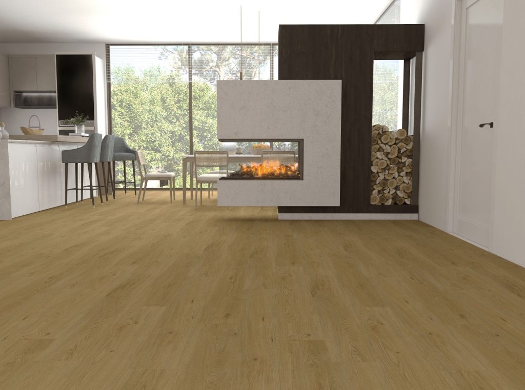 Kvarcvinylgolv med hög slitstyrka, vattentätt, med fasade kanter, med en speciell ljudisolerande undersida som ger komfort och effektiv värmeledning.