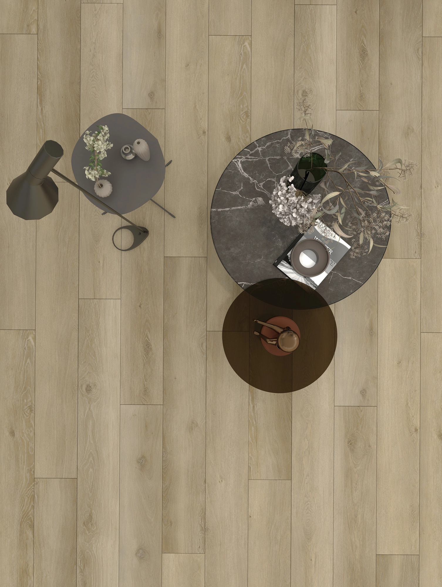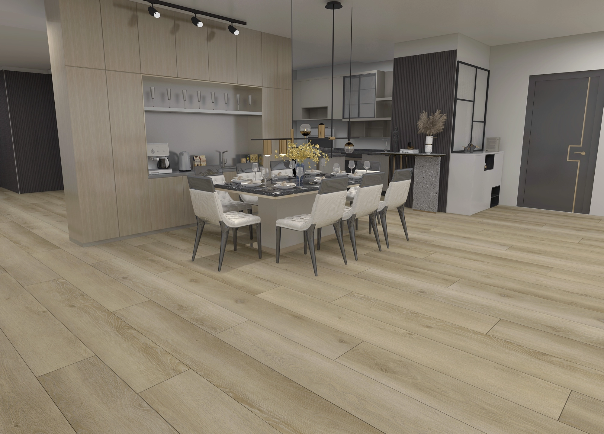 Kvarcvinylgolv med hög slitstyrka, vattentätt, med fasade kanter, med en speciell ljudisolerande undersida som ger komfort och effektiv värmeledning.