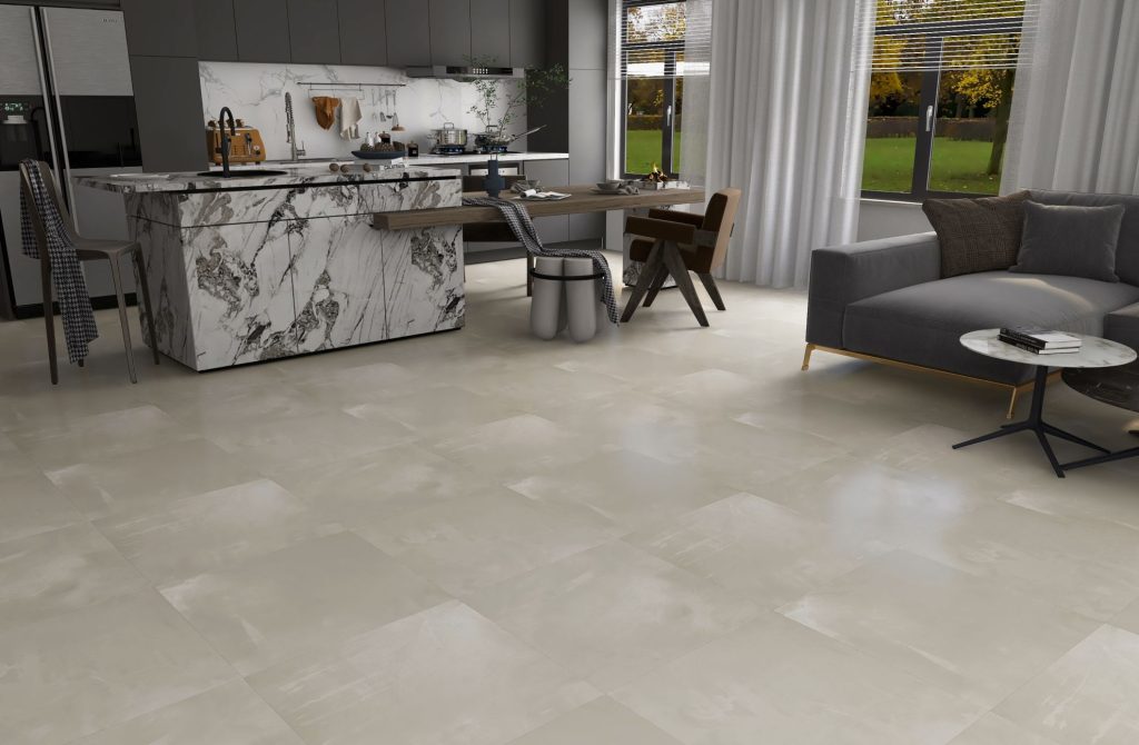 Kvartsvinylgolv med hög slitstyrka, vattentätt, med fasade kanter och en speciell ljudisolering underlag som ger komfort och effektiv värmeledning.