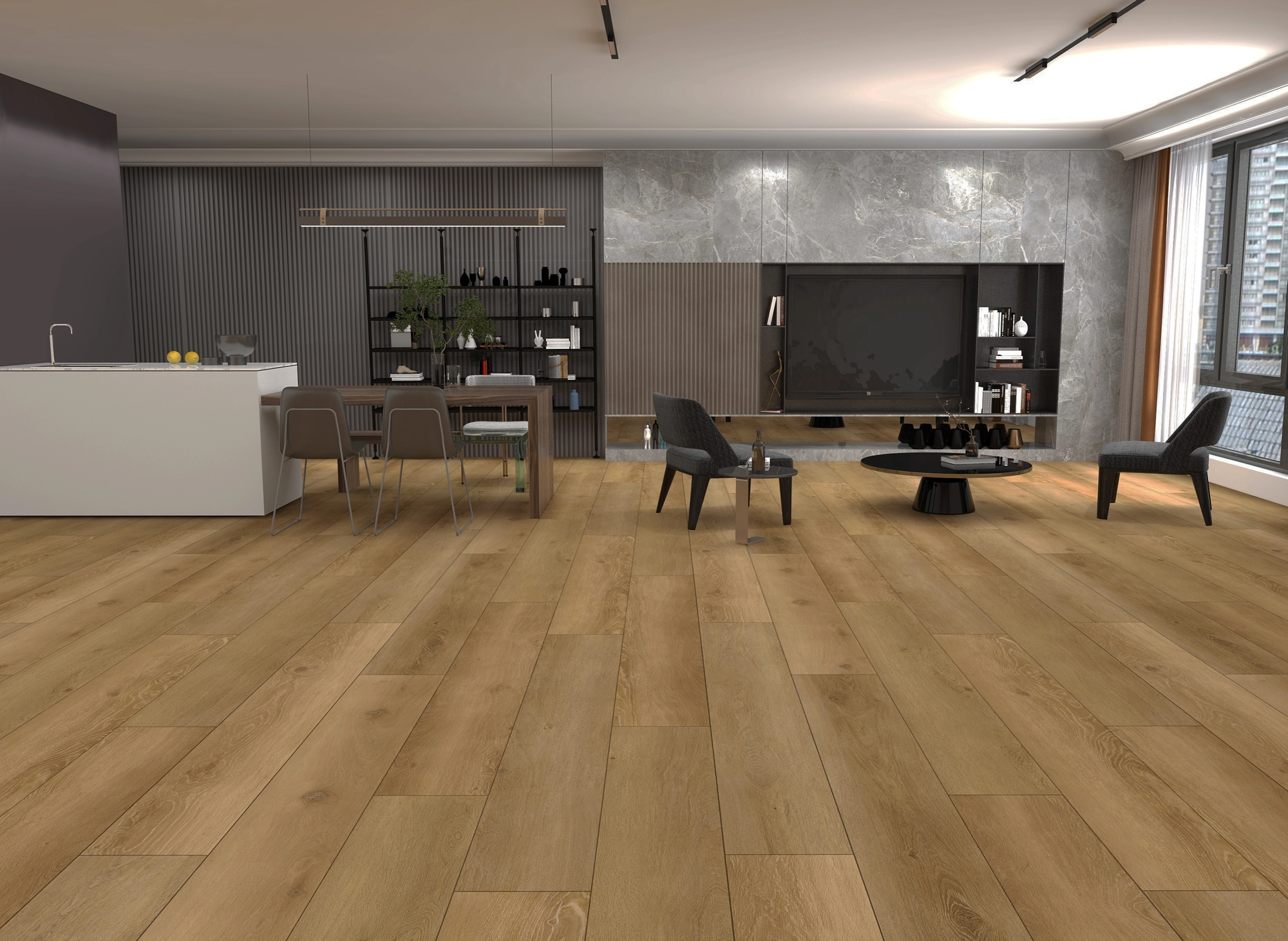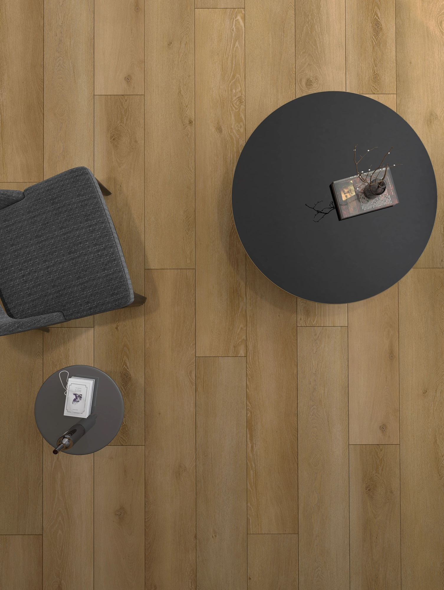 Kvarcvinylgolv med hög slitstyrka, vattentätt, med fasade kanter, med en speciell ljudisolerande undersida som ger komfort och effektiv värmeledning.