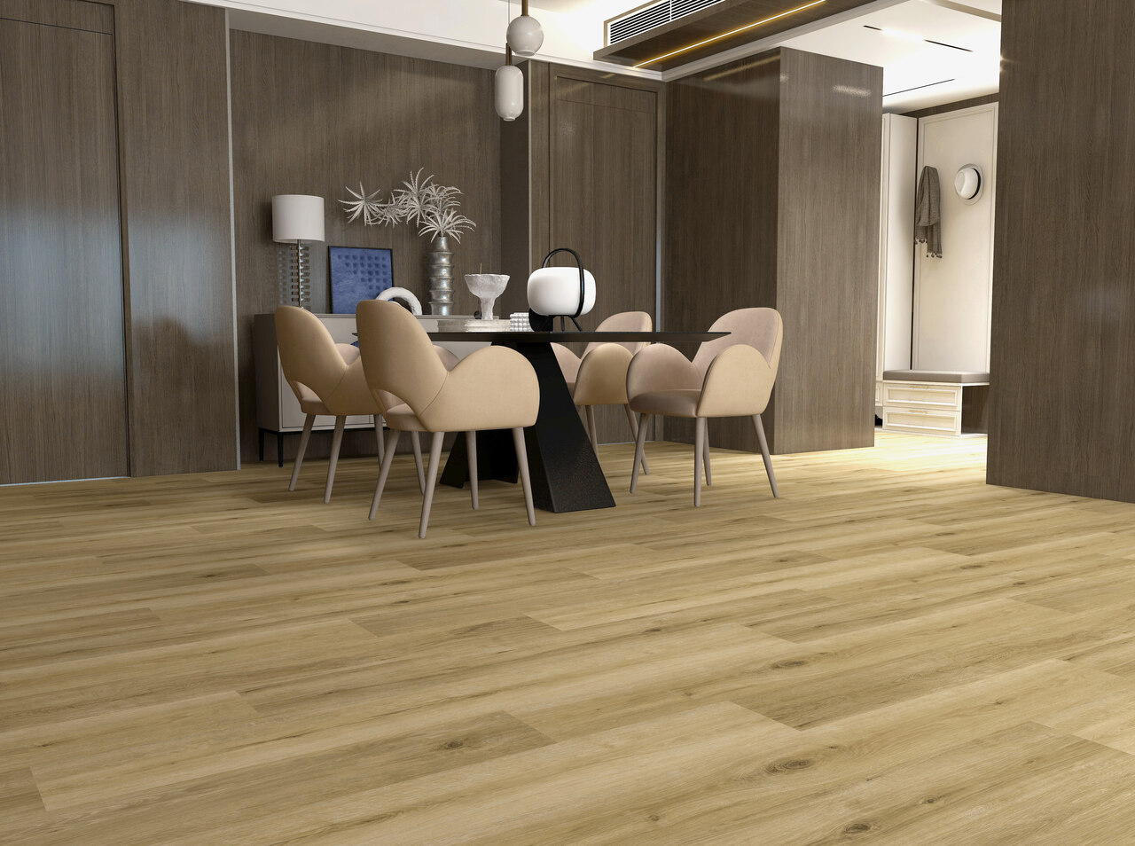 Ett kvarcvinylgolv som är vattentätt och motståndskraftigt mot slitage. Det har fasade kanter och en speciell dämpande underlagskärna som isolerar ljud, ger komfort och bra värmekonduktivitet.