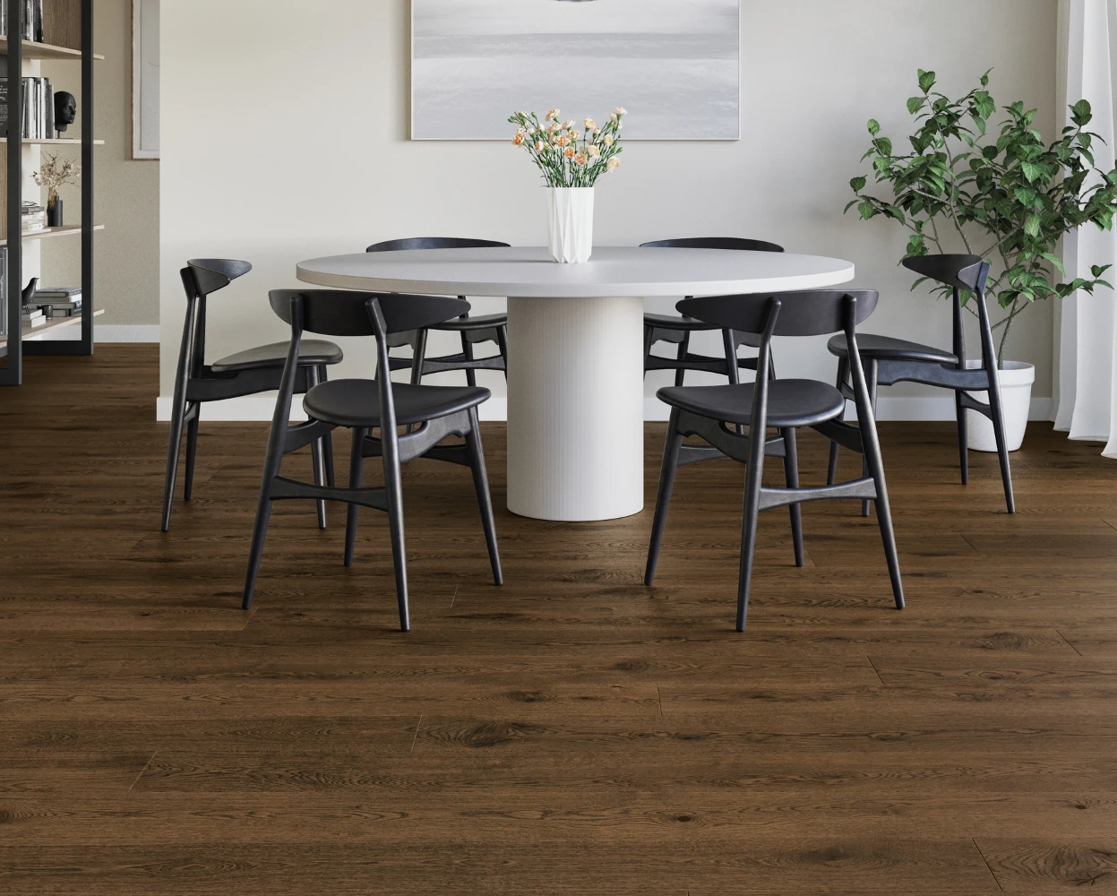 Trisskikts ekparkett, enstavig bräda, mattlackad, borstad yta, med fas på alla fyra sidor.
