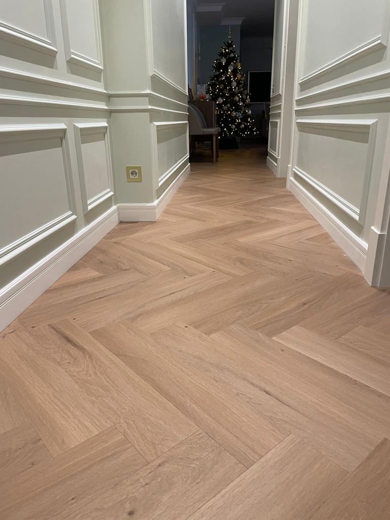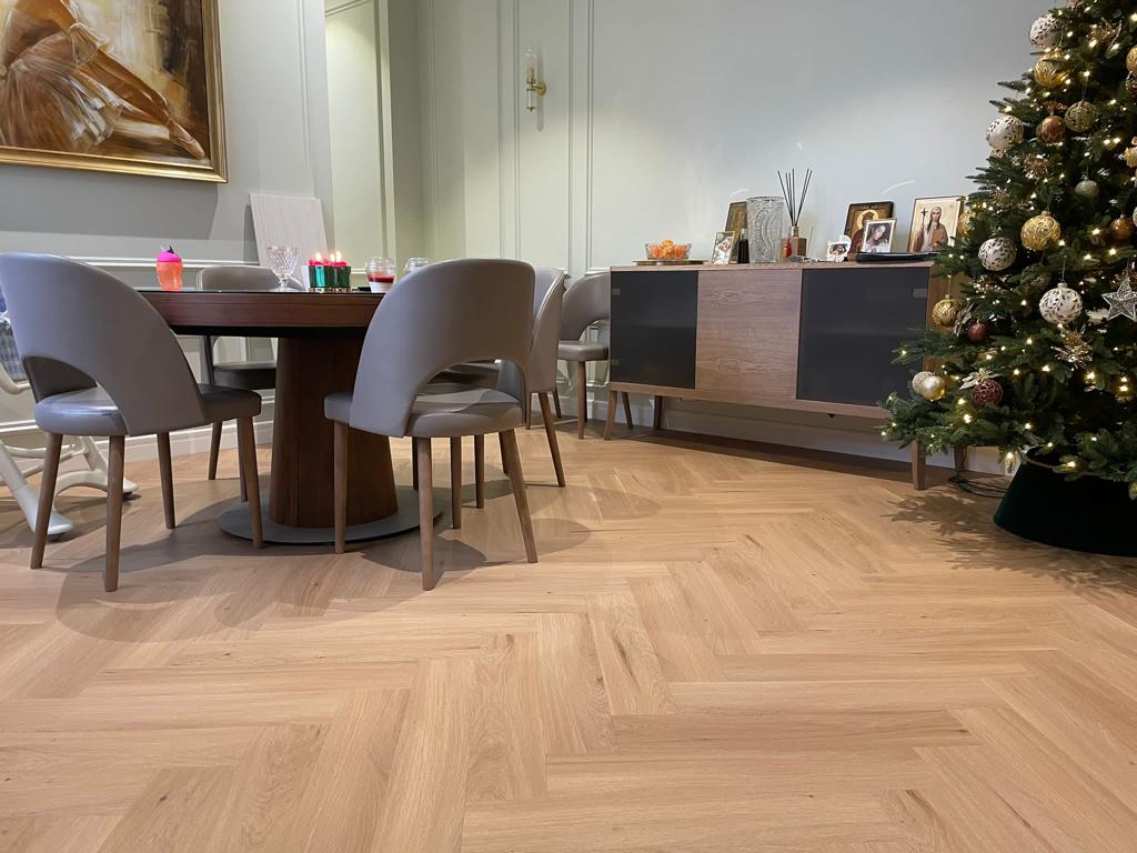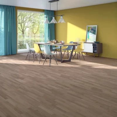Kvarcvinylgolv med hög slitstyrka, vattentätt, med fasade kanter, med en speciell ljudisolerande undersida som ger komfort och effektiv värmeledning.
